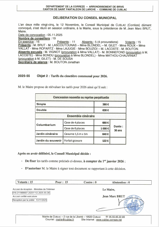 TARIF CIMETIERE 2026